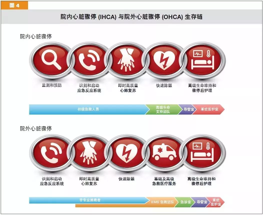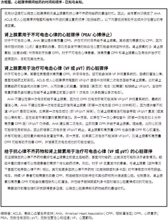 理由:尚无RCT直接研究肾上腺素给药时间对心脏骤停结局的影响。16项观察性研究的数据使用了早期肾上腺素给药的多种定义。但所有研究均表明,肾上腺素早期给药与ROSC率更高相关。不可电击心律性心脏骤停缺乏其他有益的干预措施,而且这些心脏骤停在接受肾上腺素治疗后ROSC率和生存率较高,这些为建议尽早应用肾上腺素以抑制不可电击性心律奠定了基础(下图有误点)。对于可电击心律的心脏骤停,应立即给予高质量CPR和除颤,并给予肾上腺素和抗心律失常药物治疗电击难治性室颤/无脉性室速。