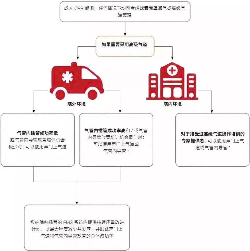 理由:对于在心脏骤停期间放置高级气道的建议,前提是医师应具有初步的培训和技能、以及插入气道并确认适当位置的经验,同时对胸外按压的干扰降至最低。因此,应根据医师的技能和经验以及患者的需求,确定选择球囊面罩通气还是置入高级气道装置。经常操作和培训是保持较高的气道管理总体成功率的重要措施,并作为持续质量改进的一部分。因此,如果不对气道管理成功率进行追踪,就无法做出关于OHCA气道策略选择的明智决定。根据这些数据,可以为OHCA患者做出有关气道策略选择的明智决定。