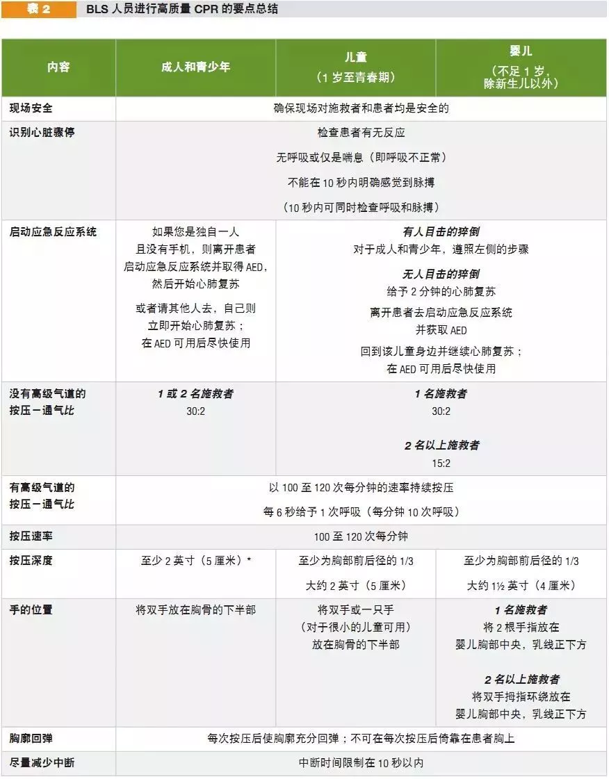 表2列出了2015版中成人、儿童和婴儿心肺复苏的关键要素(不包括新生儿的心肺复苏)。