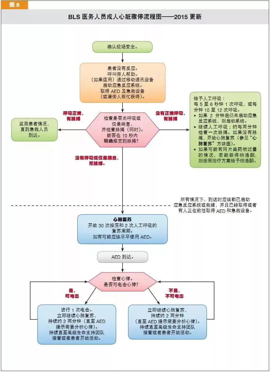 2015更新:对于医护人员,2015《指南更新》使得应急反应系统的启动及后续处理更加灵活,更加符合医护人员的临床环境。理由:BLS流程中的步骤按照传统以一定顺序的形式呈现,以便帮助单一施救者区分操作的先后顺序。但是,任何复苏过程中都受多项因素(例如骤停类型、地点、附近是否有受过培训的救护人员以及施救者是否需要离开患者启动应急反应系统等)影响,可能需要调整BLS的顺序。更新的医护人员 BLS流程图旨在说明哪些时候,哪些地点可以按顺序灵活处理。