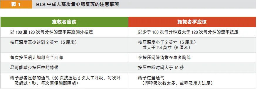 - 运用绩效指标,进一步强调了高质量心肺复苏(包括以足够的速率和深度进行按压,保证每次按压后胸廓回弹,尽可能减少按压中断,并避免过度通气)。见表1。